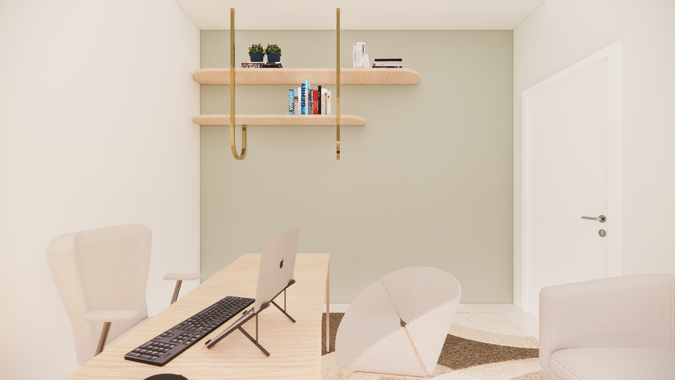 Consultórios: Os consultórios seguem uma linha minimalista e funcional, com mobiliário ergonômico e estantes decorativas com plantas e livros, criando um ambiente leve e profissional. A decoração discreta e as cores suaves contribuem para que os pacientes se sintam confortáveis e à vontade durante o atendimento.